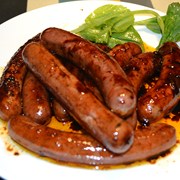 纽伦堡香肠、姜,蒜、番茄酱,泰式甜辣酱、红酒,黄油。