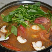 虾、文蛤、鱼丸、蟹棒、草菇金针、时蔬、西红柿、午餐肉、冬阴功酱、香茅酱、姜、蒜。