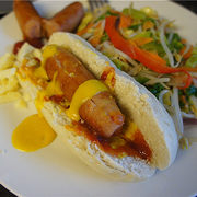 热狗肠、面包 (长条形)、时令蔬菜、橄榄油、乳酪、英式芥末、沙拉酱。