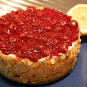 鸡蛋、面粉、淀粉、烤粉、鱼胶、全脂奶油奶酪、柠檬皮、糖粉、樱桃水、柠檬汁、奶油、酸樱桃、杏仁片。