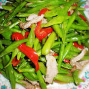 四季豆、里脊肉、蒜瓣、红椒、盐、鸡精、淀粉、料酒、玉米油。
