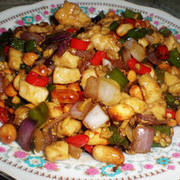 鸡脯肉、花生米、青红椒、洋葱、生姜、蒜碎、蛋清、淀粉、料酒、盐、玉米油、生抽。