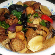 肉丸、鱼丸、木耳、洋葱、杏鲍菇、肉片、青红椒、玉米油、盐、鸡精、生抽。