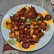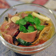 熟驴杂、芹菜、蒜苗、红薯粉、牛肝菌、鸡枞菌、木耳、干辣椒、西红柿。
