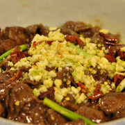 牛肉、金针菇、鸡腿菇、牛肝菌、蒜苗、水煮肉调料、干辣椒、蒜、盐。
