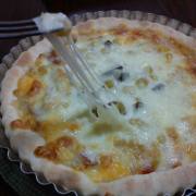 披萨面皮、车达奶酪片、马苏里拉奶酪、披萨酱、甜玉米粒、火腿。