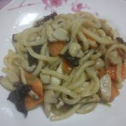 乌冬面、胡萝卜、迷你杏鲍菇、木耳、小葱、蚝油。