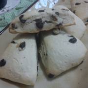面粉、糖、巧克力豆、葡萄干、泡打粉、鸡蛋、绿茶油。
