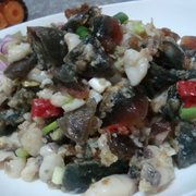 皮蛋、鱼肉、红椒、鸡蛋清、淀粉、葱、姜、蒜、盐、鸡精。