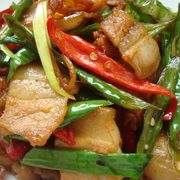 五花肉、青杭椒、红辣椒、蒜苗、盐、鸡精、酱油。