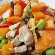 猪肉、胡萝卜、青豆、水发香菇、红辣椒、盐、白胡椒粉、鸡粉、姜丝。