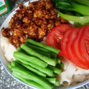 刀削面、猪肉、洋葱、长豆角、西红柿、青菜、葱伴侣豆瓣酱、辣椒酱、盐、鸡汤。