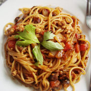意大利面、瘦肉、洋葱、番茄、蒜。