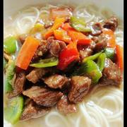牛肉、青、红辣椒、拉面、盐、老抽、料酒、嫩肉粉、鸡精、姜、蒜、食用油。
