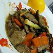 猪肝、红辣椒、红萝卜、水发木耳、鸡精、老抽、料酒、盐、水淀粉、葱、姜、蒜。