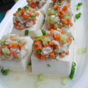 嫩豆腐、鲜肉、红萝卜、生姜、芹菜、葱、盐、白糊椒粉、蚝油、料酒、鸡精。