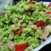 毛豆、瘦肉、红辣椒、蒜末、白糖、鸡精、盐。