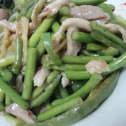 瘦肉、蒜苔、盐、生抽、鸡精、淀粉、生姜、清水。