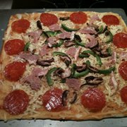 面粉、意大利面酱、青椒、意大利香肠、蘑菇、培根、奶酪。