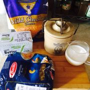 意大利面、切达奶酪丝、牛奶、黄油 ( 融化 )、盐。