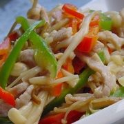 猪里脊肉、青红彩椒、金针菇、鸡蛋清、盐、味精、白糖、料酒、香油、葱、水淀粉。