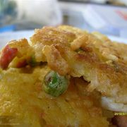 米饭、鸡蛋、青豆、蟹棒、火腿肠。