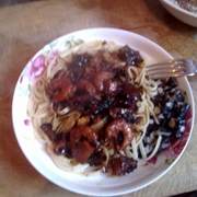 面条、红烧鱼籽、油爆虾、红烧海鱼、油走蹄髈、墨鱼饼、葱段、盐、鸡精、酱油、糖、海鲜酱、高汤。