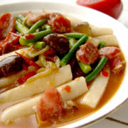 广式腊肠、年糕、西红柿、干香菇、蒜苔、葱姜碎、剁椒、鲜味生抽、鸡精。