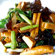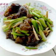 蒜苗、木耳、炒好的肉丝、五香豆干、葱姜碎、生抽、鸡精。