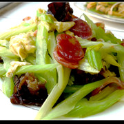 西芹、鸡蛋、广式腊肠、木耳、葱姜碎、盐、生抽、味精。