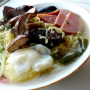 康师傅鲜虾鱼板面、香菇、木耳、火腿、鸡蛋、大白菜叶。