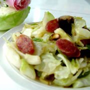 卷心菜、腊肠、干香菇、青椒、葱姜碎、生抽、盐、鸡精。