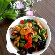 大青虾、黄瓜、红椒、葱姜末、木耳、油、盐、料酒、生抽、番茄酱、蚝油、鸡精、原汁上汤。