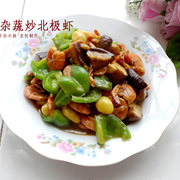北极虾、大青椒、白果、干香菇、葱姜末、油、盐、料酒、淀粉、蚝油、鸡精。