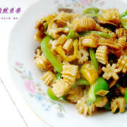 鱿鱼卷、大青椒、青红辣椒、鲜香菇、葱姜蒜丝、大喜大辣烤肉酱、蚝油、料酒、盐、鸡精。