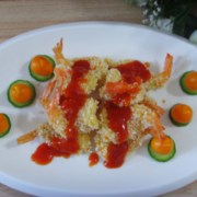 竹节虾、金钱桔、黄瓜、面包糠、亨氏番茄沙司、糖、盐。