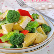 西兰花、油豆腐、红椒、葱、姜、盐、鸡精、香油。