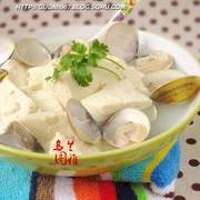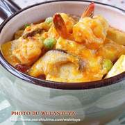 北豆腐、鲜虾、香菇、洋葱、豌豆。