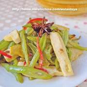 冠军芸豆、白豆干、大料、盐、鸡精、葱、姜、红椒丝、香油。