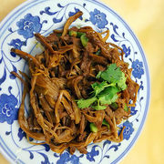 肉、黄花菜、葱姜、青椒丝、植物油、花椒粉、盐、蚝油。