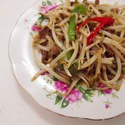 绿豆芽、肉、葱、姜、红椒、料酒、盐、蚝油。