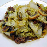 口蘑、白菜、肉、料酒、植物油、盐、淀粉。