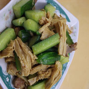 黄瓜、水发腐竹、肉、葱姜蒜、植物油、料酒、糖、盐、蚝油、花椒粉。