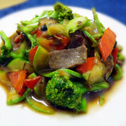 西兰花、香菇、葫萝卜、角瓜、肉、葱姜、植物油、料酒、糖、盐、蚝油、花椒粉、水淀粉。