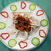鱿鱼、蒜、陈醋、盐、蒸鱼豉油、番茄酱、辣椒酱、麻酱、糖。