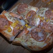 香柔、玉米热狗肠、番茄酱、现磨黑胡椒、普通奶酪、马苏里拉奶酪。