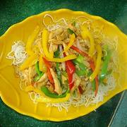 鸡胸肉、彩椒丝、洋葱丝、粉丝、食用油、生抽、盐、醋、糖、水淀粉、料酒。