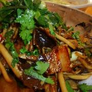 茶树菇、五花肉、洋葱、香菜末、生抽、糖、鸡精、青红辣椒末、料酒、姜蒜片。
