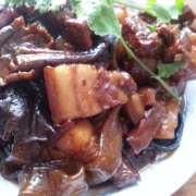 五花肉、粉条、土豆、榛蘑、老抽、干红辣椒、八角、姜块、香叶、盐、香菜。