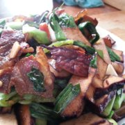 腊肉、蒜苗、小红椒、青椒、豆干子、郫县豆瓣酱、盐、味精、鸡精。